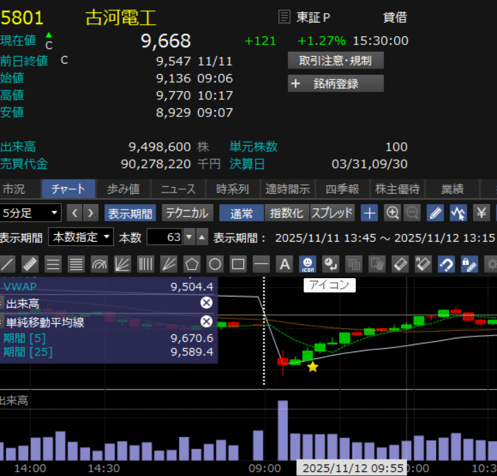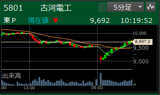 古河電工はうまくいった。角度、そして出来高。キオクシアとは全然違う。明らかなGCってとこも。