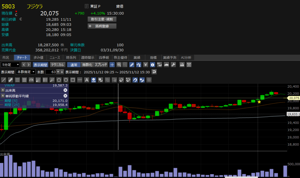 あとフジクラ、早漏利確してしまった。マイルール通り持っておけばもっと伸ばせたのに、怖くて売ってしまった。★のとこで。5日MA崩れてない&出来高も減ってない(むしろ増えてる)から売る理由がない。こんなことしてると損小利大にはなれない。