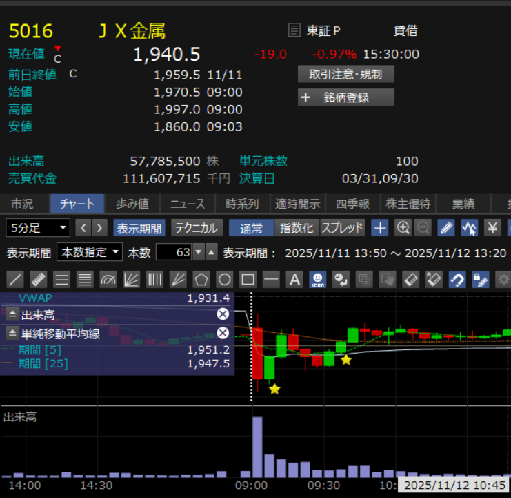という結果なんだけど、あらためて振り返ると出来高が全然違うよね。JX金属はやはり出来高が小さい。少なくとも最初の1本目の半分程度はあるといいのかもしれない、目安として。