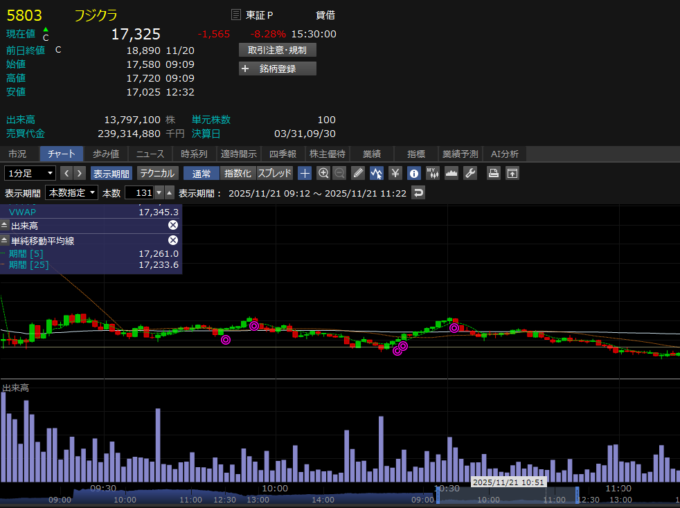 勝ってる方の売買例。アドバンのはS安での成買いからの即(1分以内)に売却。フジクラは出来高をかなり上げてのセリングクライマックスからの反転てやつか?